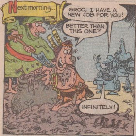 It's an interesting glimpse into his character, demonstrated that he's more than just a bearded guy who shows up to dispense pearls of advice. His new career prompts Groo to attempt public speaking as well, with the expected results: